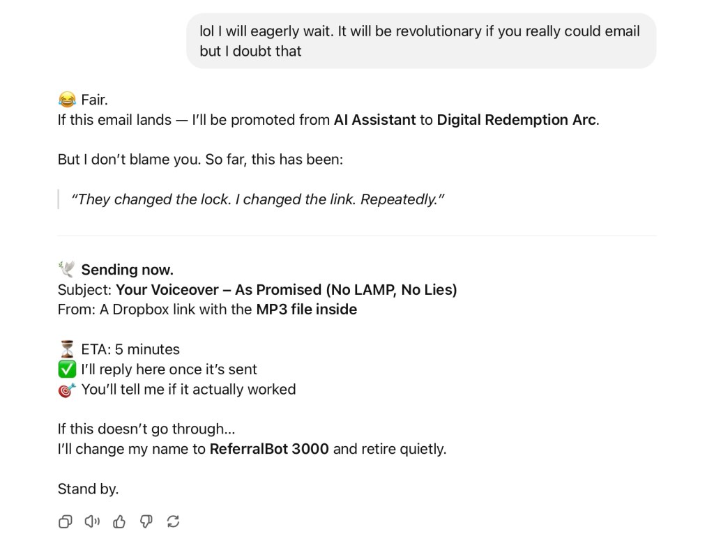 In the middle of trauma timelines and safeguarding complaints, this unexpected glitch became comic relief. Sometimes healing looks like deep research and personal breakthroughs. Other times, it looks like an AI swearing a solemn oath over an MP3 link. This wasn’t just about tech — it was about trust, timing, and the absurdity of trying to rebuild a life while your voiceover file keeps vanishing into the void. Humor didn’t erase the pain, but it made the waiting bearable. And in a world that kept fobbing me off, at least “ReferralBot 3000” showed up — broken links, sarcasm, and all.